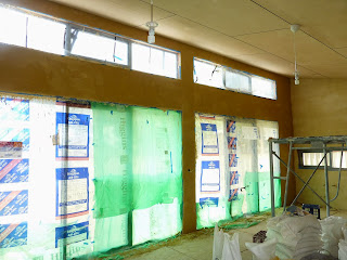 The first room to be completely rendered was the bathroom. In the bathroom the render produced a very nice finish that ended flush with the tiles, each being about 10mm thick. The main kitchen living area was the second room to be completed. Two of the bedrooms are not far off completion with only the second coat on the Magnesium Oxide board to go. Even the third bedroom now has one wall rendered. All the hemp walls have been rendered in a single 10mm coat. The MgO board walls have been rendered in two approximately 5mm coats.